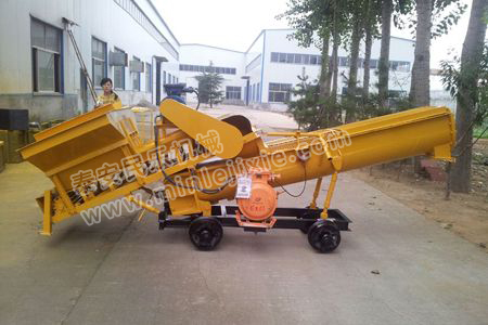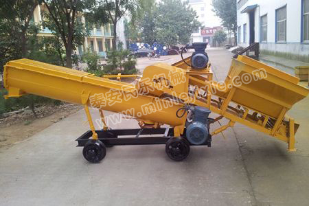 本攪拌機為便于運輸及存放,采用分體式結構。水泥輸送帶、沙子輸送帶、細石輸送帶為一部件,螺旋攪拌為一部件。為便于活動以上各部件都裝有拖輪或滾輪。運輸時攪拌機構放下支腿使導軌輪離地即可裝車運輸。