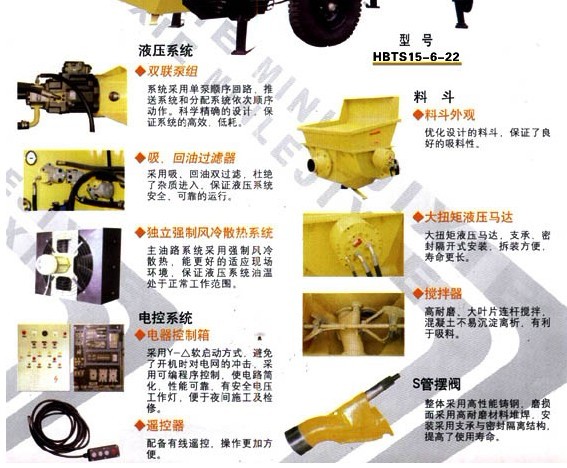 電機 主油泵(現在一般用韓國川崎的進口主油泵) 電磁閥(國內用華德的多) 料缸 主油缸(國內品牌好的是協(xié)力油缸) 潤滑泵 (6路潤滑泵)風冷(冷卻液壓油的,也有廠家用水冷,水冷工地需要接水,就是這個麻煩一些)電控柜 (PLC歐姆龍的比較好點)。